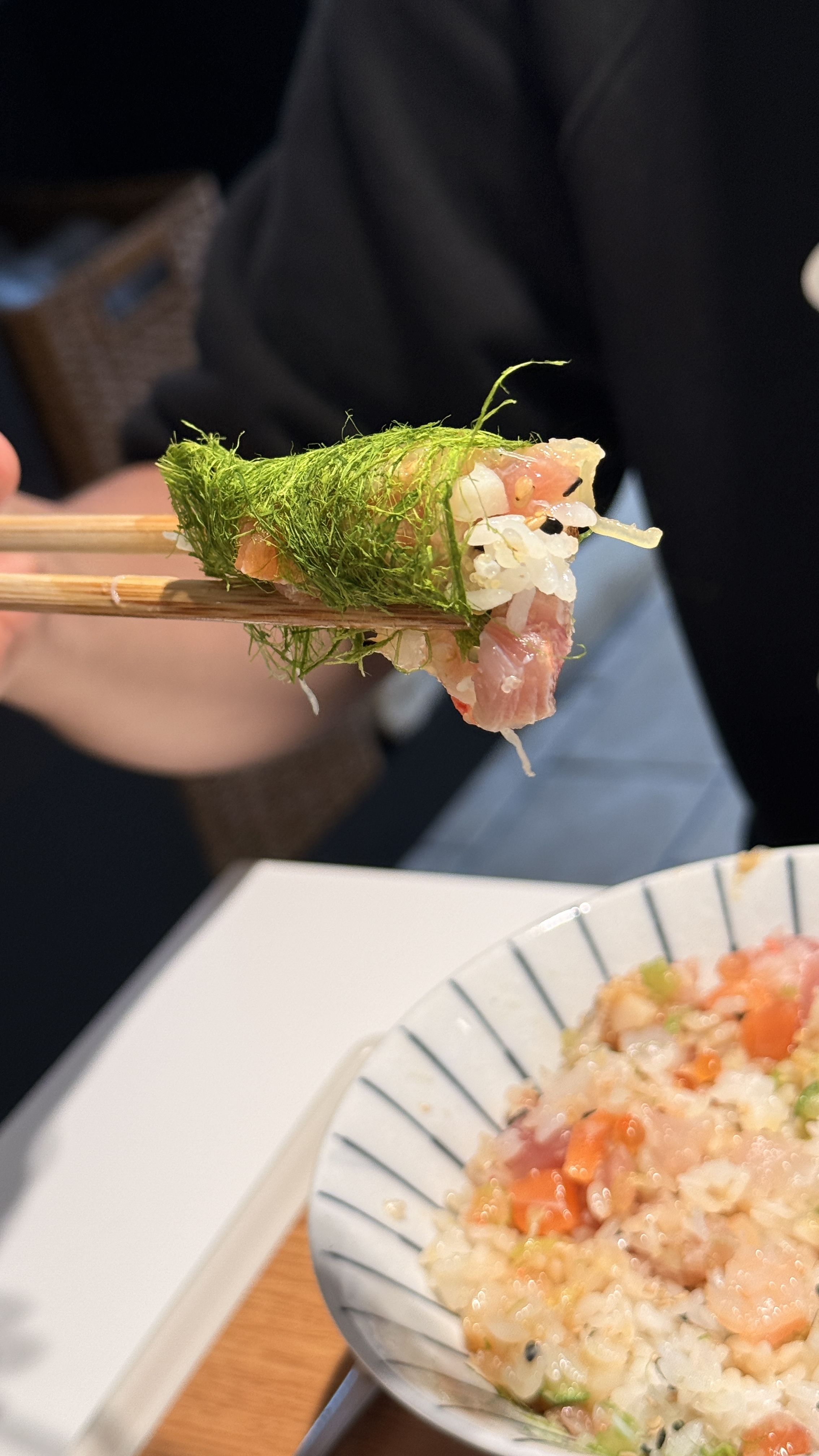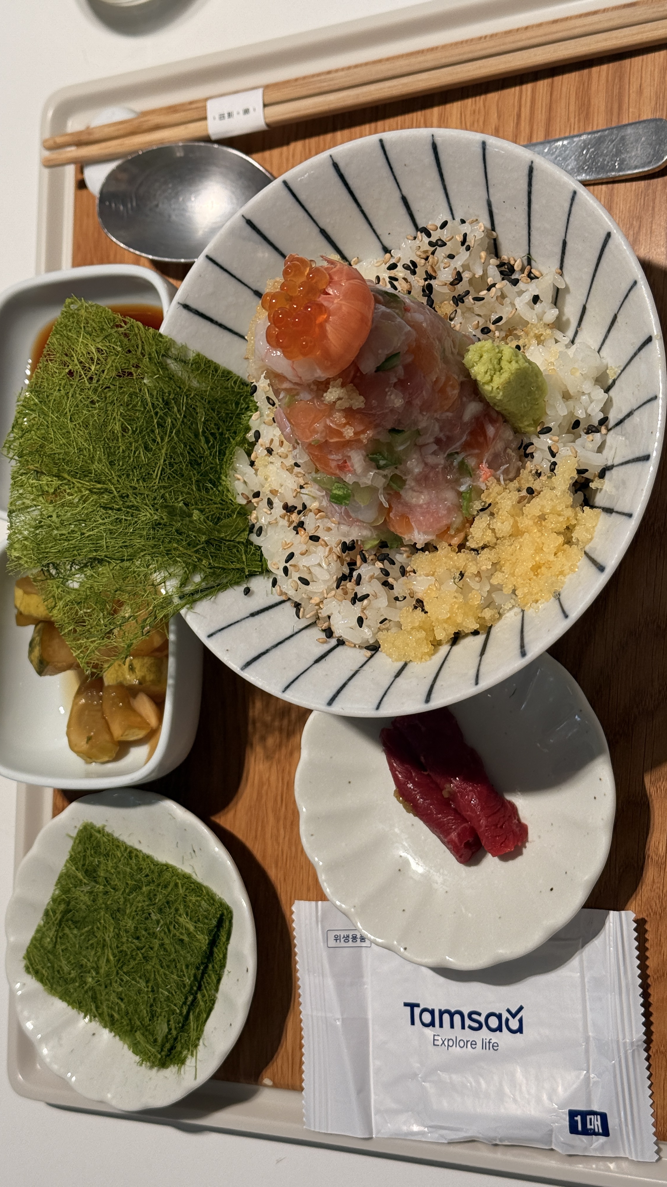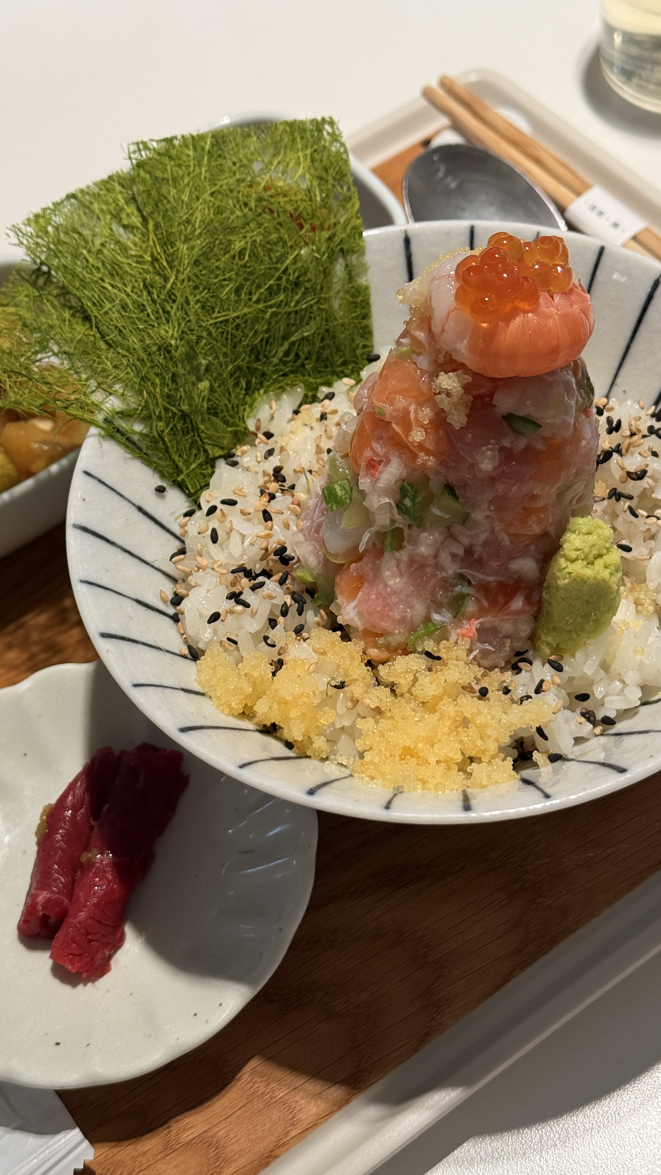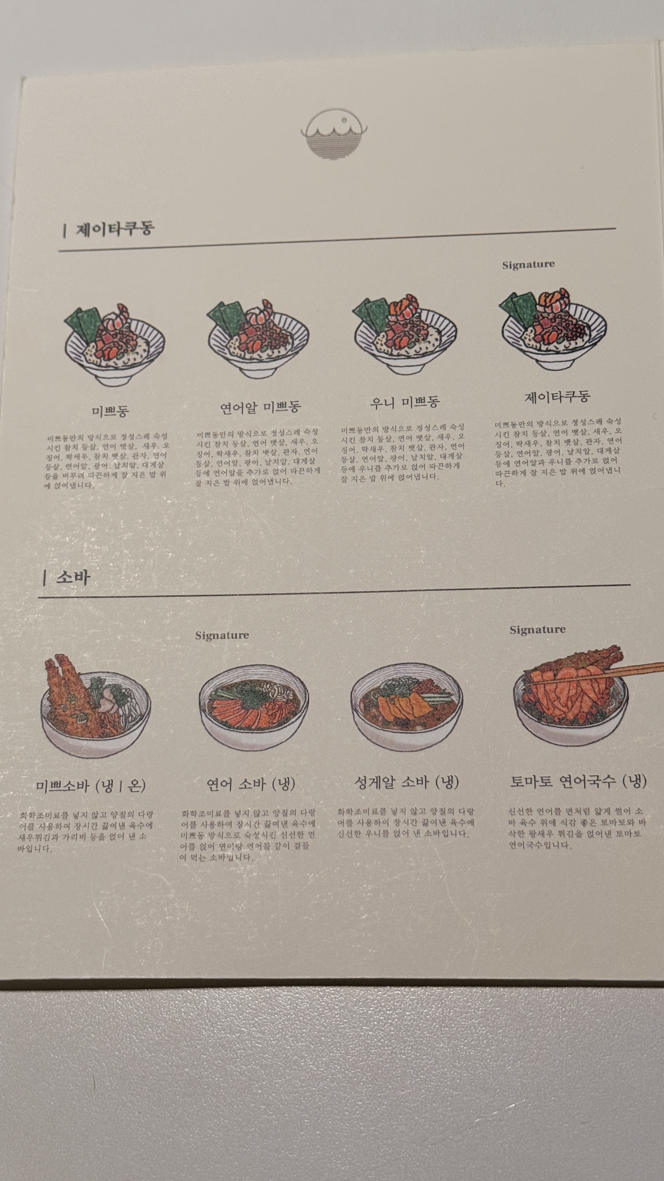 한줄 요약 : 참치등살·연어뱃살·새우·오징어·딱새우가 한 그릇에 조화로운 미쁘동과, 연어를 면처럼 즐기는 토마토연어국수(메밀면 추가)가 모두 훌륭했습니다. 특히 밥 1/3 정도 남기고 따뜻한 육수를 부어 먹는 마지막 한 그릇이 이날의 하이라이트!