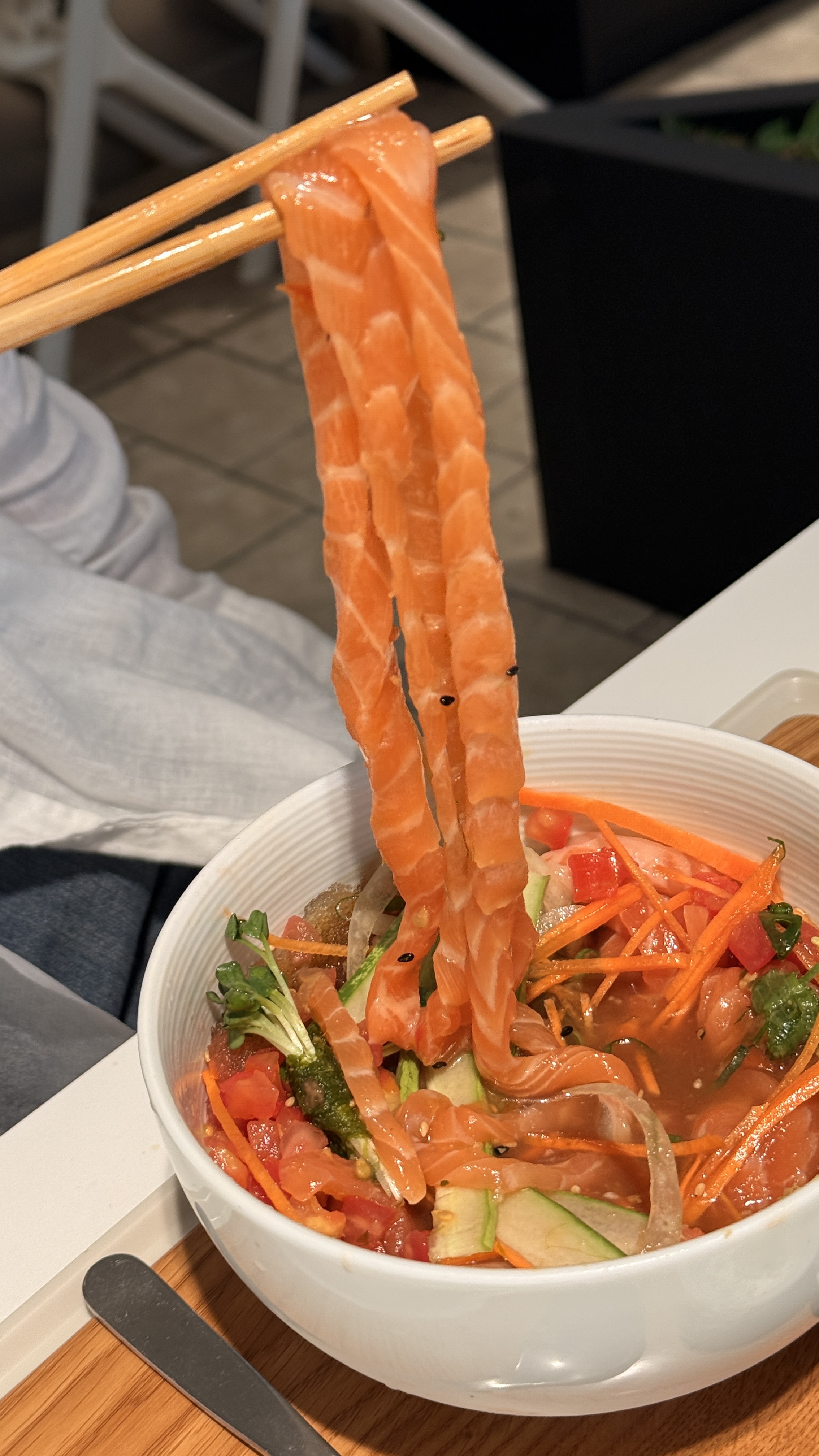 토마토연어국수는 말 그대로 연어를 면처럼 즐기는 재미가 있습니다. 차게 즐기는 스타일이라 첫입부터 상큼·시원, 그리고 연어의 결이 살아있어 식감이 정말 만족스러웠습니다. 메밀면 추가로 식감 대비와 포만감이 더 좋아졌습니다.